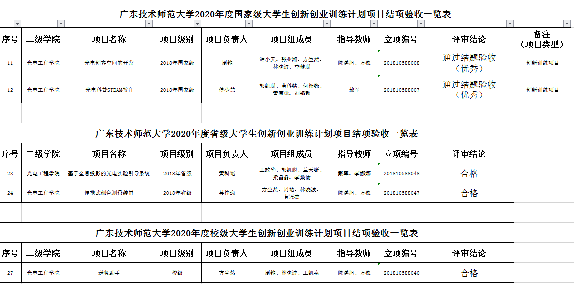 根据学校工作安排,经各二级学院初审,大学生创新创业训练计划工作小组组织专家终审,学校对196项大学生创新创业训练计划项目进行了结项验收。确定《广东叶枝道有限公司》等17项项目为优秀项目;《微元教育》等154项项目为合格项目;《广清一体化区域发展问题及策略研究》等25项项目为不合格项目。现将结项验收结果(详见附件)予以公示。