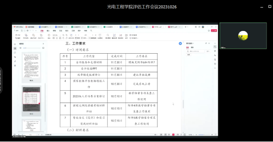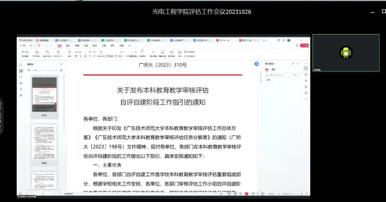 10月26日,光电工程学院召开了2023年本科教育教学审核评估工作推进线上会议。会议由学院副院长陈湛旭主持,何影记院长、各系部主任、专业负责人及学院部分教师参加了会议。