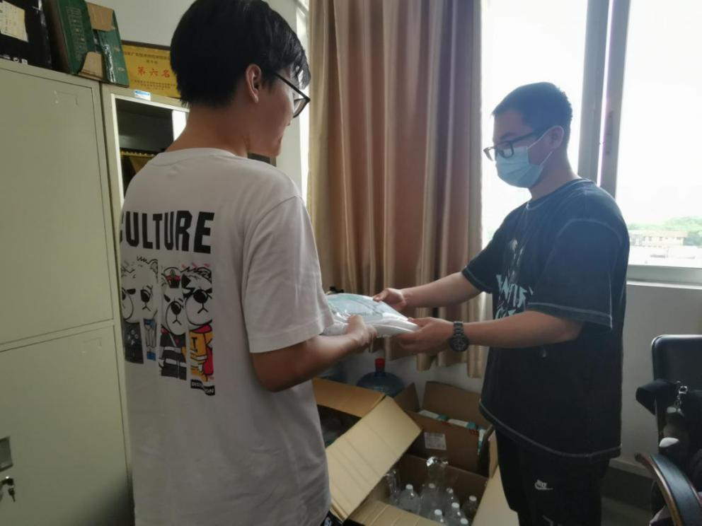 6月18日,叶海强辅导员为学生发放抗疫爱心大礼包,礼包包括医用防护口罩、免洗洗手液、酒精喷雾与酒精湿巾。在发放过程中,叶海强辅导员叮嘱学生,遇到困难要及时向老师反馈,平日里要戴口罩、勤洗手、不聚集。同学们纷纷对学院的关怀表示感谢,并提出将严格遵守疫情防控的要求,好好学习,健康生活。在日常生活中,我院全体政工干部经常走访学生宿舍,了解学生的日常生活情况和防疫情况,要求同学们每日按时健康上报,嘱咐同学们平时外出活动时戴好口罩,减少不必要接触。