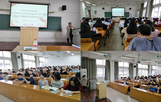 为进一步学习、传达、贯彻落实习近平总书记参加广东代表团审议时的重要讲话精神,提高我院学生的政治思想水平,光电工程学院于2018年4月12日下午16:00在二教505,召开了光电工程学院学生学习贯彻习近平总书记参加广东代表团审议时的重要讲话精神专题会议。参加此次会议的有:光电工程学院辅导员李娜娜老师、光电工程学院代理辅导员陈远明老师以及光电工程学院全体在校学生。