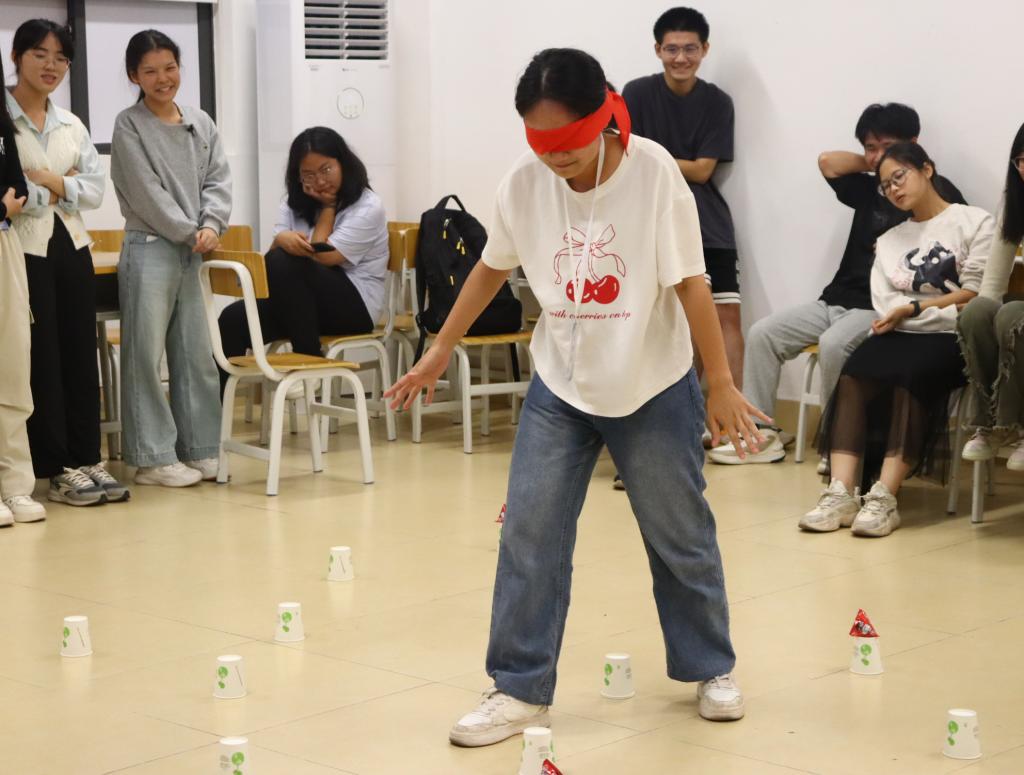 本次团体活动以热身游戏“大风吹”游戏拉开序幕,在游戏过程中,同学们逐渐消除彼此间的隔阂,进入轻松愉悦的状态。接下来,郑雨欣带领大家共同探讨团体规则,并达成共识,形成了温暖信任的氛围。随后,郑雨欣带大家进行“解开千千结”游戏,同学们需要在不松手的情况下,解开一个个复杂的“千千结”。活动过程中,同学们相互鼓励,紧密配合,深刻体验和认识到积极沟通与团结协作在人际交往中的重要性。在“你说我听”的活动环节,同学们纷纷敞开心扉,分享了自己在宿舍或成长过程中遇到的“千千结”,通过认真聆听故事,并从自己的角度出发出主题、提建议,同学们更加深入地了解自己的内心世界,以及自己在人际关系中的不足。随后,郑雨欣带领同学们开展“穿越雷区”,蒙住眼睛的同学需要在指挥员的正确指引下,穿越惊险刺激的“雷区”。这个活动让同学们认识到了在团体中相互信任、以及双向沟通的重要性。
