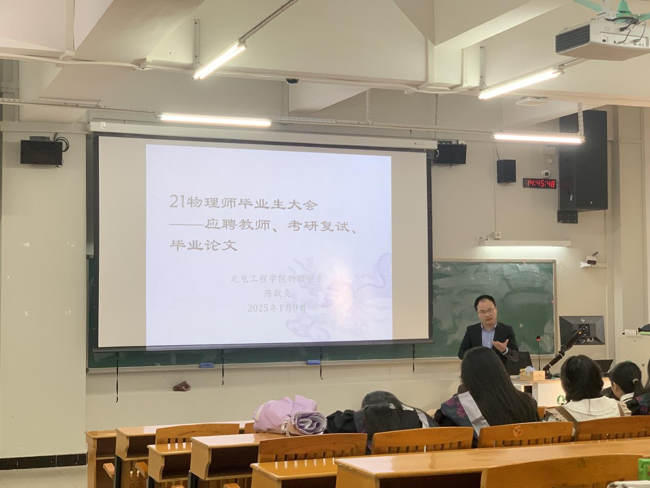 随后,系主任贾涛、陈耿炎分别面向光电信息科学与工程专业、物理学(师范)专业毕业生,从升学就业、学业成绩、论文答辩四个维度,强调了毕业生离校前需要完成的重点工作。贾涛鼓励光电专业学生树立“先就业、再择业、后立业”观念,拓宽就业思路,主动就业;陈耿炎细致梳理了物理学(师范)生的毕业去向,指出应聘教师的同学要“四多”:多投递简历、多跑招聘会、多笔试面试、多交流经验,破“四维”:唯大湾区、唯老家、唯编制、唯中学,并从“复试内容和备考”两个方面为备考研究生的同学进行了指导。最后,两位老师详细明确了毕业设计时间周期和阶段性流程,希望同学们认真对待毕设,按时提交论文,注意学术规范。
