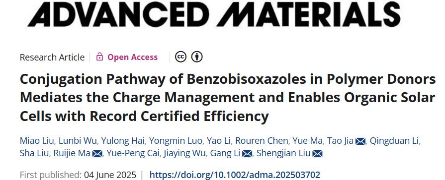此外,贾涛副教授团队与华南师范大学刘升建研究员团队合作在聚合物太阳电池给体材料设计方面取得重要进展。6月4日,研究成果以题为《Conjugation Pathway of Benzobisoxazoles in Polymer Donors Mediates the Charge Management and Enables Organic Solar Cells with Record Certified Efficiency》的论文,在线发表在国际顶级学术期刊《Advanced Materials》(IF=27.4,中科院一区TOP期刊)。光电工程学院硕士研究生吴伦比为共同第一作者,贾涛副教授为通讯作者,我校为通讯署名单位。