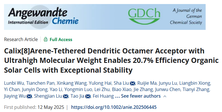 该研究围绕新型树枝状受体分子的设计及光伏应用展开。研究团队设计了以杯[8]芳烃为核心、分子量超过14000 g/mol、具有精确结构的树枝状受体分子C8-IC。独特的树枝状结构赋予了分子多维的电荷输运能力,增强了分子间的相互作用,抑制了分子的扩散,并调控其结晶特性。基于C8-IC构建的二元和三元有机太阳能电池分别实现了18.7%和20.7%的领先光电转换效率,且表现出优异的稳定性。5月12日,该研究成果以题目《Calix[8]Arene-Tethered Dendritic Octamer Acceptor with Ultrahigh Molecular Weight Enables 20.7% Efficiency Organic Solar Cells with Exceptional Stability》在《Angewandte Chemie International Edition》(IF=16.1,中科院一区TOP期刊)在线发表。光电工程学院硕士研究生吴伦比为论文第一作者,贾涛副教授为通讯作者,我校为第一署名单位。此外,该研究成果于6月5日被Springer Nature跨刊编辑团队副主编Joel Cejas Sánchez博士在《Nature Synthesis》以Research Highlight形式专题报道,对本项工作进行了系统性介绍与专业点评,充分肯定了其在相关领域的创新意义与学术价值。