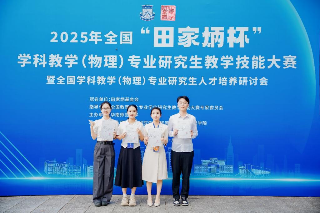 11月7日-9日,2025年全国“田家炳杯”全日制教育硕士专业学位研究生学科教学(物理)专业教学技能大赛决赛在华南师范大学举行。本届大赛共有来自76所高校199名选手晋级决赛,经过激烈角逐,我院4名研究生凭借扎实的专业功底和稳定的现场发挥,均荣获三等奖,展现了我院在学教育硕士培养的阶段性成果和学生的良好素养。