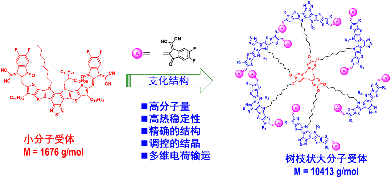 聚合物太阳电池因其轻便、柔性、半透明以及可卷对卷溶液加工等独特优势,广受关注,并且在特定应用场景下,能够与传统硅太阳电池形成互补。然而,迄今为止,聚合物太阳电池的服役稳定性仍然是一个亟待解决的难题。活性层组分(特别是非富勒烯小分子受体)的结晶诱导的形貌降解,是影响器件稳定性的主要因素之一。针对这一挑战,研究团队采用烷基链连接策略,成功高产率合成了分子量超过10000 g/mol的树枝状电子受体材料。基于该树枝状受体分子的聚合物太阳电池器件实现了19.4%的光电转换效率,创下了基于巨型分子受体材料的最高效率之一。得益于树枝状分子较高的分子量和增强的分子间相互作用,成功抑制了受体分子扩散,极大地提升了器件的长期存储和加热稳定性。这一研究成果为设计高效率且高稳定性的受体材料提供了宝贵的指导意义。