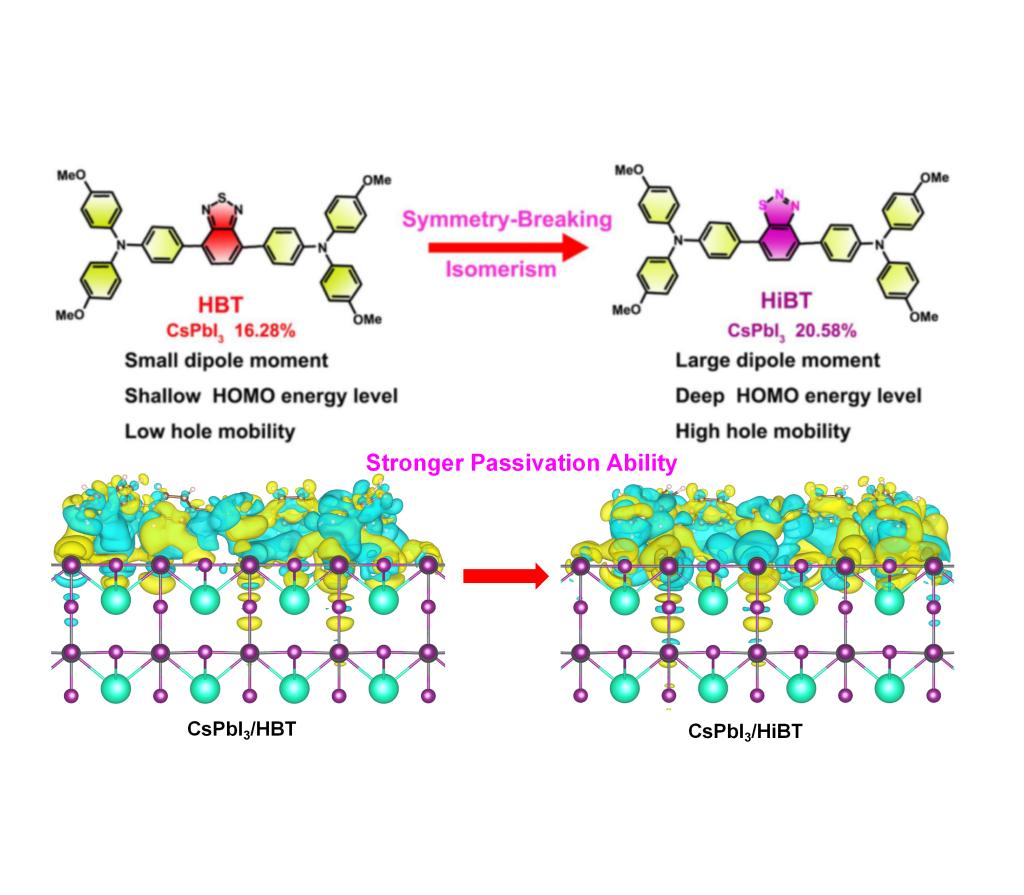 该研究围绕新型非掺杂小分子空穴传输层材料的分子设计及其在钙钛矿太阳能电池的应用展开。研究团队提出了一种对称性破缺策略,构筑了一类D-A-D型异构化小分子,并将其作为非掺杂空穴传输层(HTL)应用于全无机钙钛矿太阳能电池。研究表明,通过打破分子对称性,可有效调控分子的偶极矩、能级排布以及对钙钛矿缺陷的钝化能力,从而显著提升光伏器件的关键参数和长期稳定性。研究团队成功研制出光电转换效率高达20.58%的高稳定性器件,该效率水平位居当前文献报道的非掺杂空穴传输层无机钙钛矿太阳能电池的前列,进一步推动了高效、高稳定无机钙钛矿光伏技术的发展。该研究成果以题目《Symmetry-Breaking Strategy Yields Dopant-Free Small Molecule Hole Transport Materials for Inorganic Perovskite Solar Cells with 20.58% Efficiency and Outstanding Stability》在《Angewandte Chemie International Edition》在线发表。光电工程学院本科生蔡汇敏为该论文第一作者,贾涛为通讯作者,我校为第一通讯署名单位。